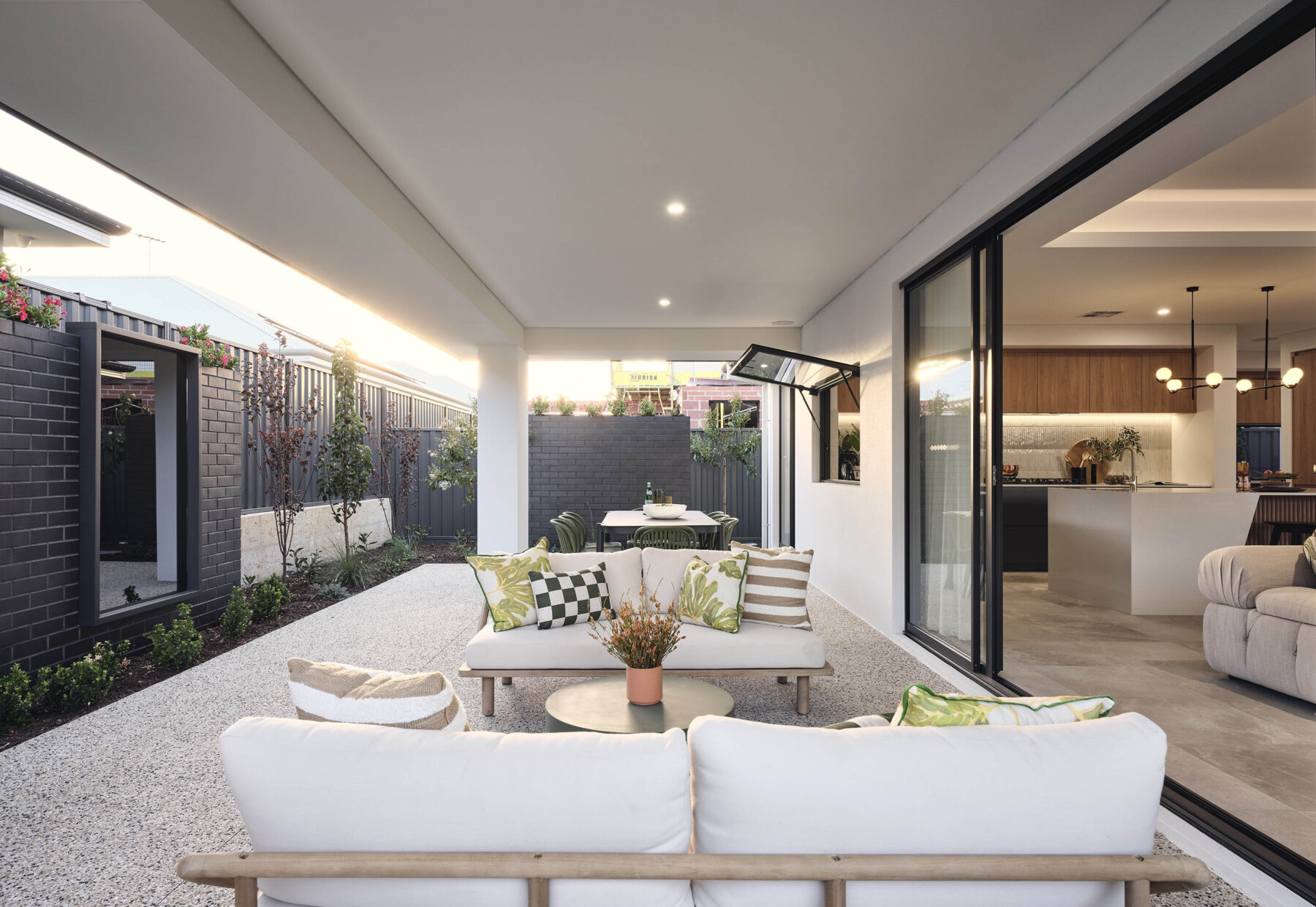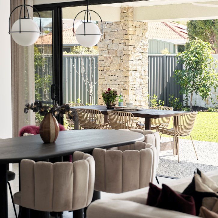 Using natural textures such as stone or walnut wood throughout both zones will make it feel more cohesive and intentional. The Idaho design on display in Jandakot taps into this by carrying similar tones and textures throughout with furniture which can be easily adapted as time changes.