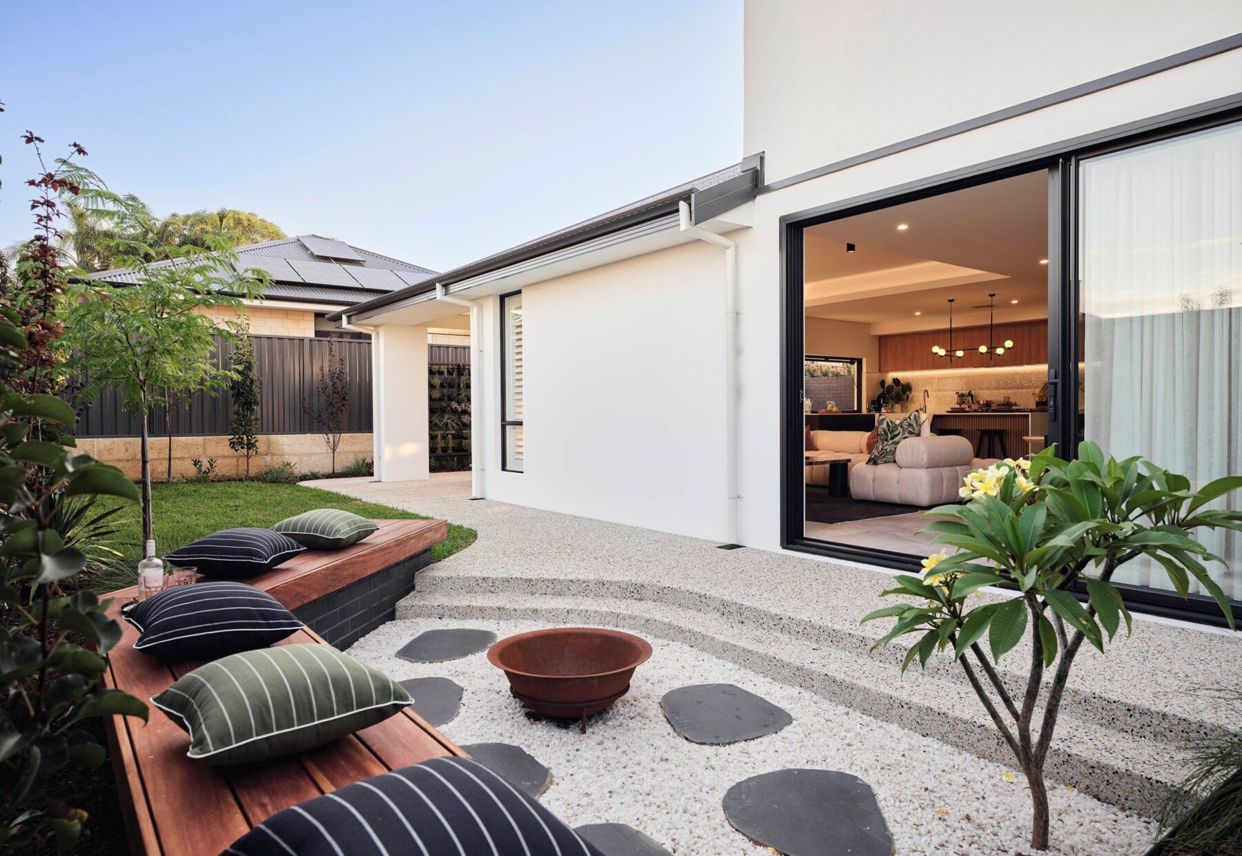 Additionally, fire pits adds warmth to your outdoor space and creates a comfortable place to gather after dark. In the Estilo design, a conversational fire pit zone was strategically placed separate to the main alfresco space, allowing extra space for loved ones to entertain in those cooler months. No need to wait months to enjoy your home.