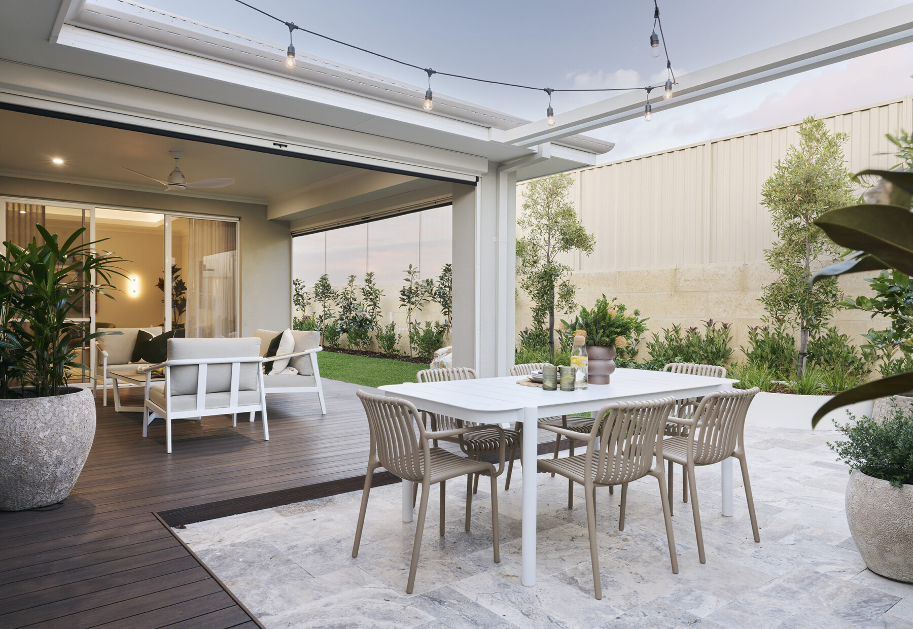 Small design choices for maximum impact include lighting, too. Well-considered lighting brings your spaces to life, shaping atmosphere and flow from inside to out. Planning for changing light conditions ensures comfort and balance year-round. Festoon lights create a relaxed, welcoming feel, perfect for outdoor areas with more than one zone.