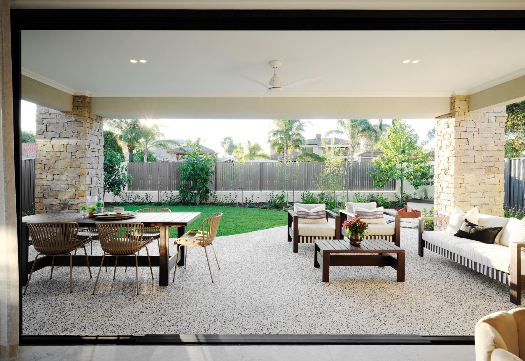 Consider bringing your home’s interior style palette outdoors for flawless integration. This may include extending indoor tiling out into your alfresco or using the same granite from your kitchen to create an outdoor bench space. By making the alfresco look and feel like the inside of your home, you’re also more likely to enjoy it all year round.