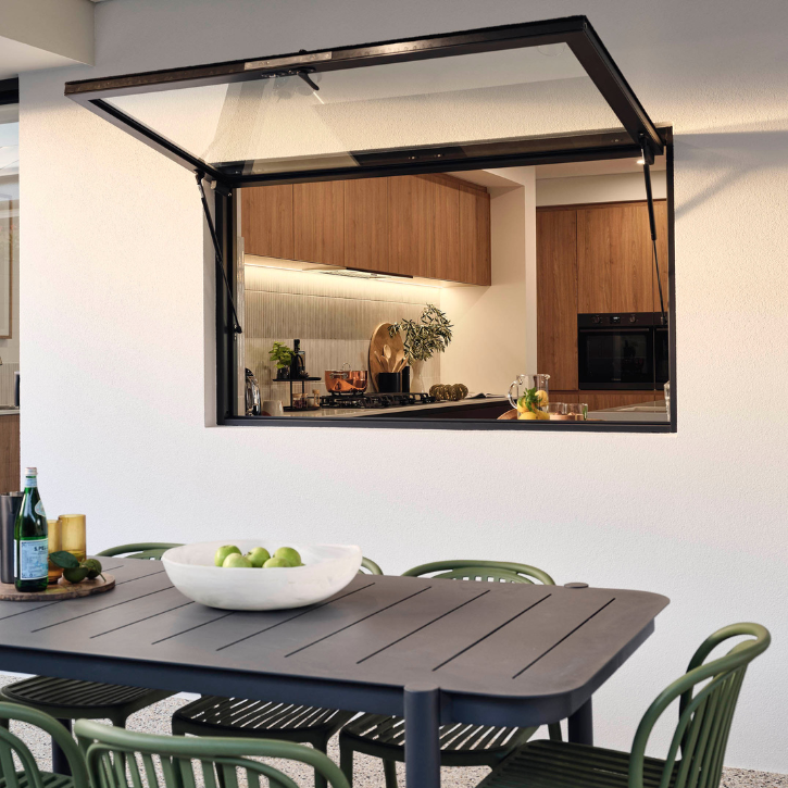 The Estilo display design showcases this indoor outdoor connection perfectly with its servery window directly into an expansive outdoor zone. When designing your dream home, our team can give you the option to work in a servery window to your kitchen design in addition to your sliding glass doors.