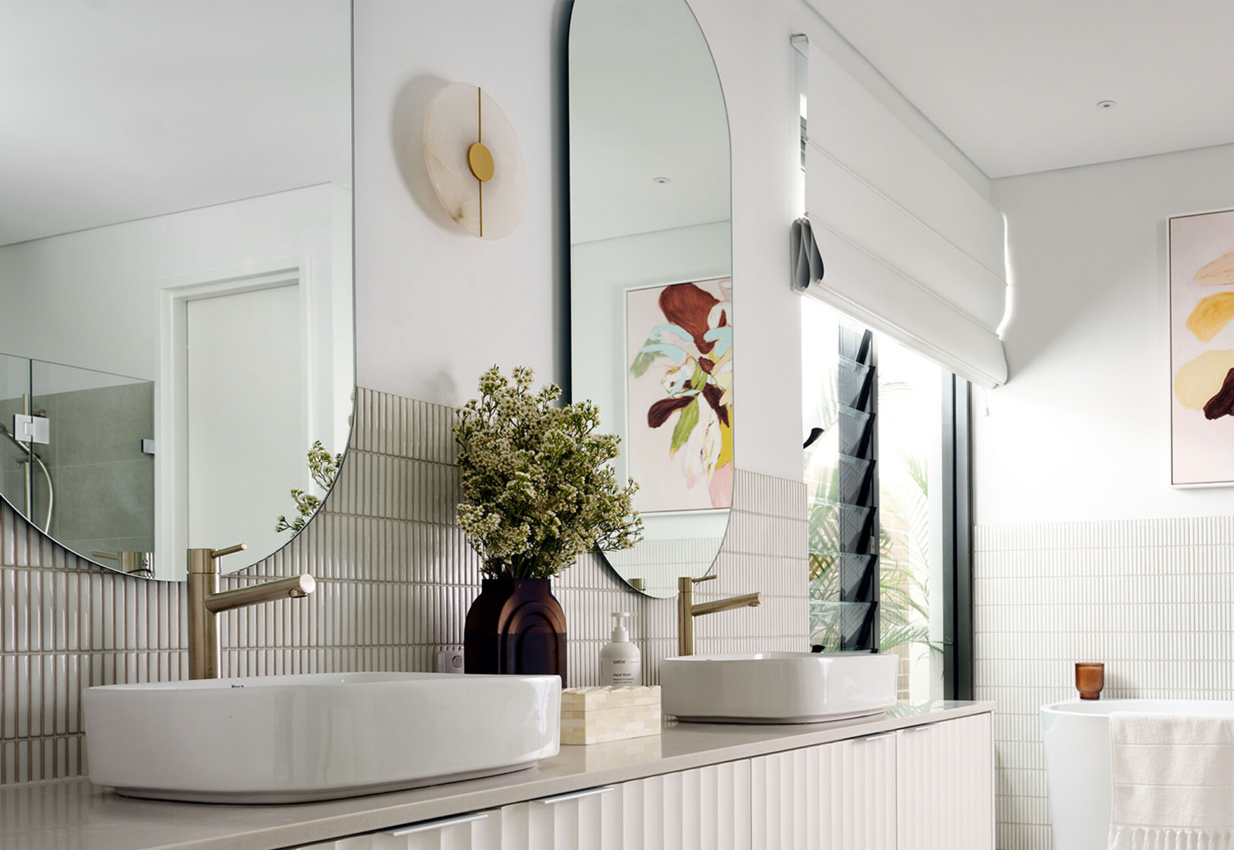 - Baylor Single Wall Lamp: Hewn from stone, each Baylor wall lamp is unique, with its own variations in texture and colour. The Baylor softly diffuses light, creating an enticing ambience that enhances the bathroom.
