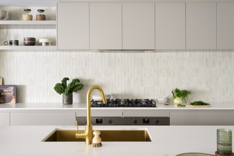 28c high overhead cupboards with bulkhead over to either side of rangehood and over fridge recess. Laminated fridge panel to suit (if required). Electrolux 700mm integrated rangehood in lieu of canopy rangehood. Black appliances including dishwasher. 2 banks of 3 pot drawers. Provision for cold water fridge tap – fridge not included. Cargo bin drawer included.
