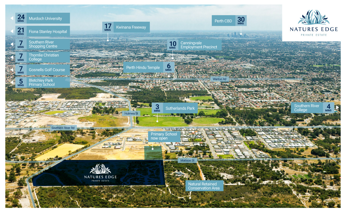 Nestled alongside stunning natural bushland, and surrounded by established schools, shops, parks, and easy transport links, Natures Edge Private Estate, located off Southern River Road, 17km from Perth CBD, is a truly special community where the grass is greener on all sides.