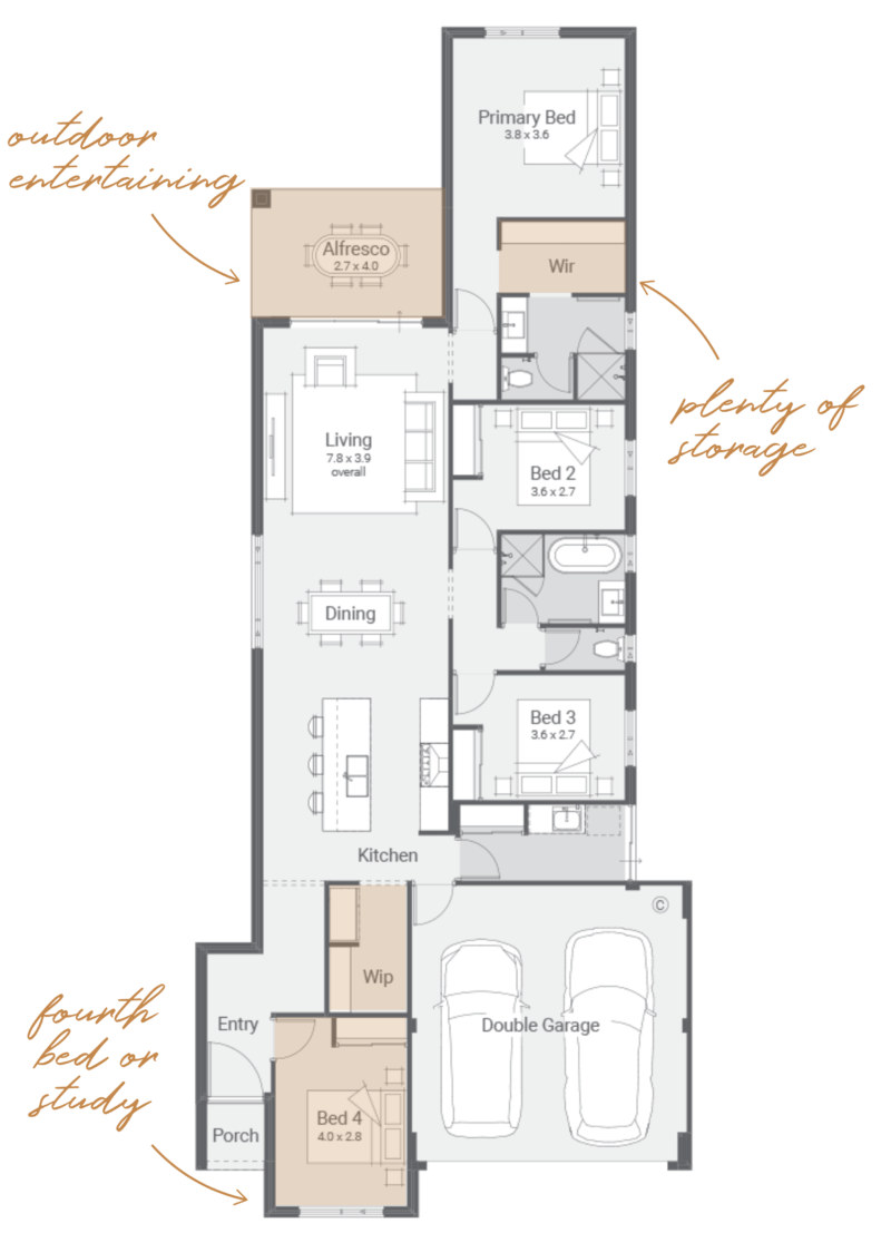 One of our most popular narrow home designs is the Ordell a four-bedroom, two-bathroom design with a large open-plan kitchen, living and dining area, plenty of storage space, plus alfresco and double garage.